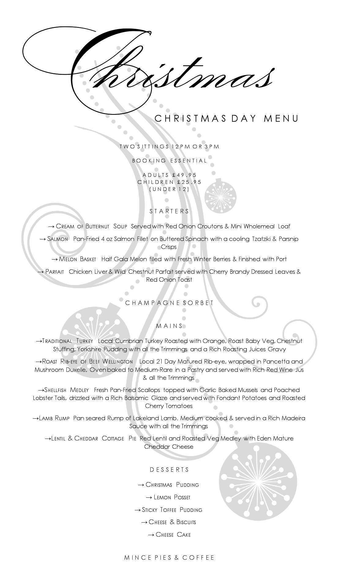 Local Cumbrian Turkey Roasted with Orange, Roast Baby Veg, Chestnut Stuffing, Yorkshire Pudding with all the Trimmings and a Rich Roasting Juices Gravy.